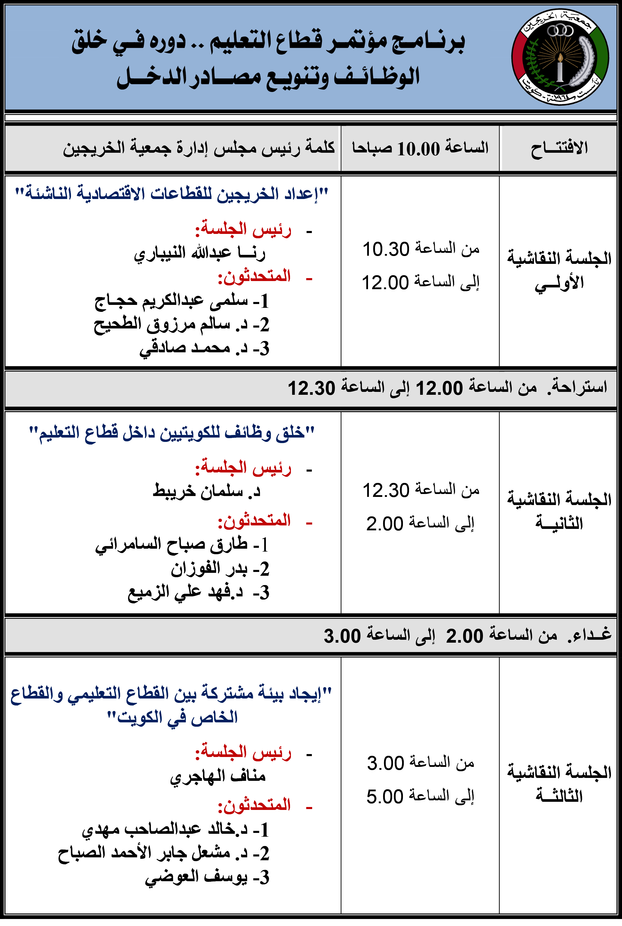تقيم جميعة الخريجين الكويتية مؤتمرا يناقش دور القطاع التعليمي في خلق الوظائف وتنويع مصادر الدخل للدولة وذلك في صباح يوم الاثنين الموافق 20 مارس وستعقد ثلاث حلقات نقاشية في مقر الجمعية يشارك فيها ممثلين من الجهات الحكومية و أصحاب الأعمال القائمين على العمل التعليمي و آخرين.
