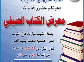 تقيم جمعيـة الخريجـين الكويتية فعاليـات معـرض الكتـاب الصيـفي بمشاركة عدد من دور النشر المحلية وذلك يومي الأحد والأثنين 21 - 22 أغسـطس 2016 خـلال الفترة المسائية من الساعة (5 م) حتى الساعة (10 م) بقاعة الشهيد مبارك النوت في جمعية الخريجين بمنطقة بنيد القار.